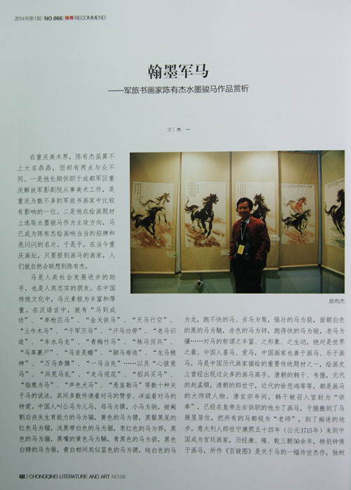 前不久,陈有杰在刚刚落成的重庆悦来国际会展中心举行了“迎马年骏马画展”,并且是实体画展与网上画展同步进行。相信在2014年中国传统的马年中,陈有杰这一骑“翰墨军马”会在艺术的道路上继续马不停蹄,一马当先。